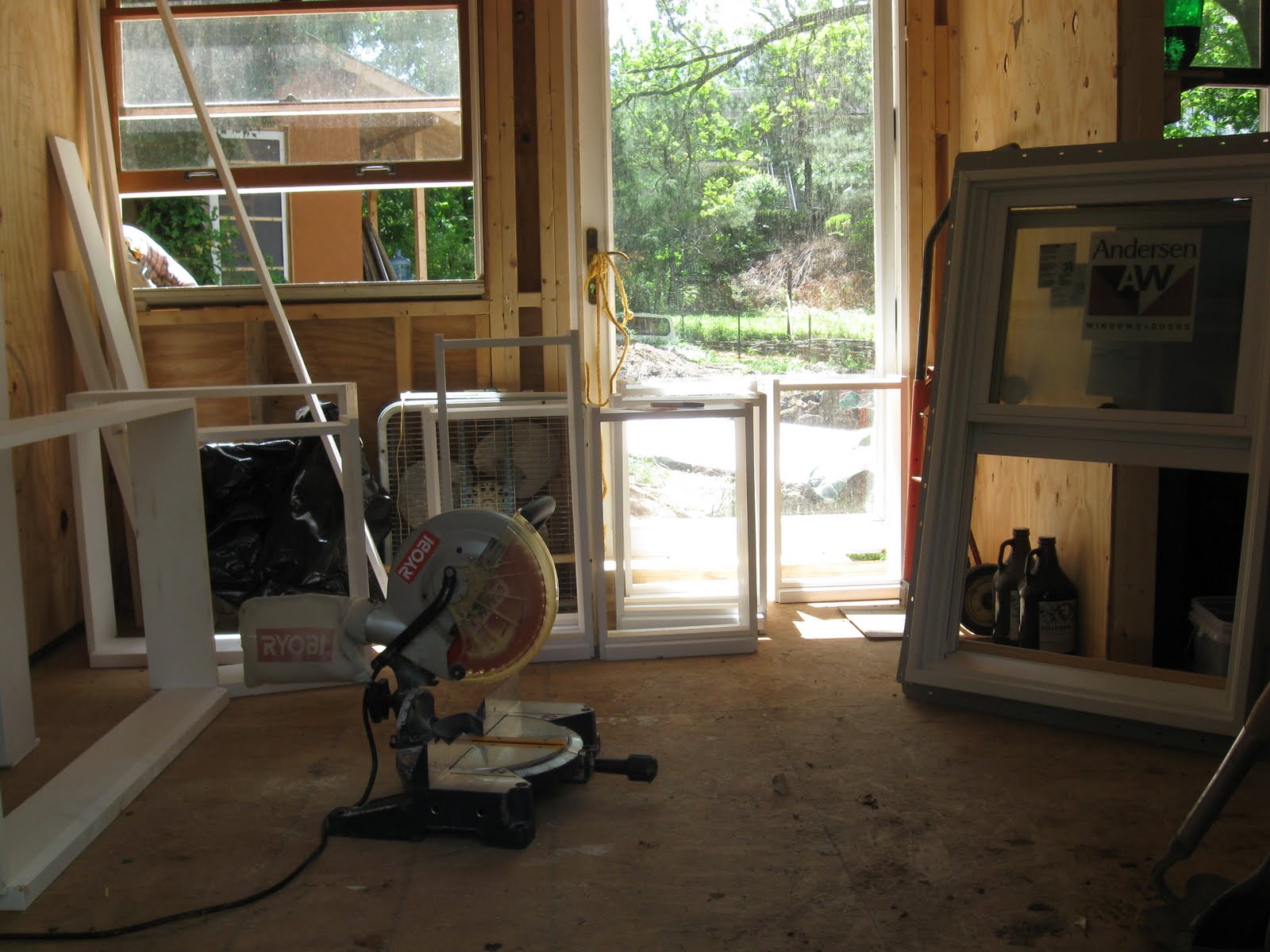 It's been far too long since posting anything about the progression of the house (and the lot). I finally have my full crew: Jeremy "Thunder" Curtiss and Michael "Arms" McDonough. Mike just arrived in town on Sunday, and began work on Tuesday. It's a really incredible experience to transition from working alone with two hands to always having six hands at the ready. Having tasks being done simultaneously is such a treat. This evening, for example, Mike was throwing up earthen plaster, Jeremy was installing the glass in the final two window frames, and I was attaching trim around the office window and back door. Three checks off the "to-do" list at the same time.